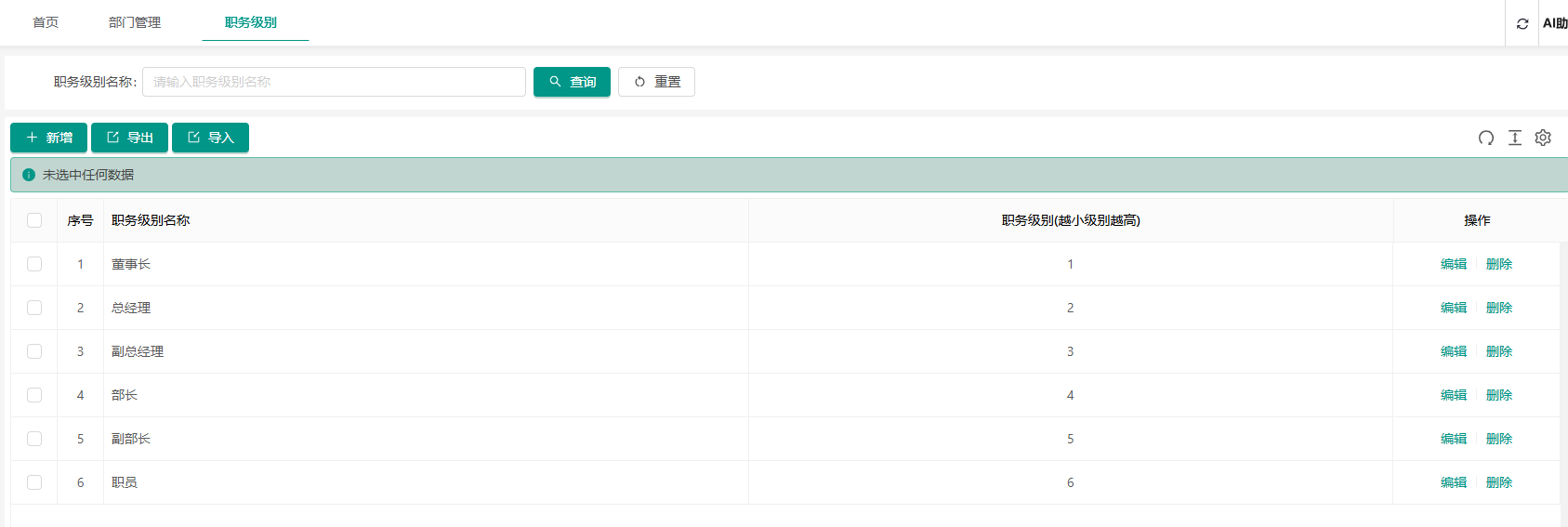 职级上下贯通:董事长 → 总/副总 → 部长/副部长 → 职员,清晰可维护。