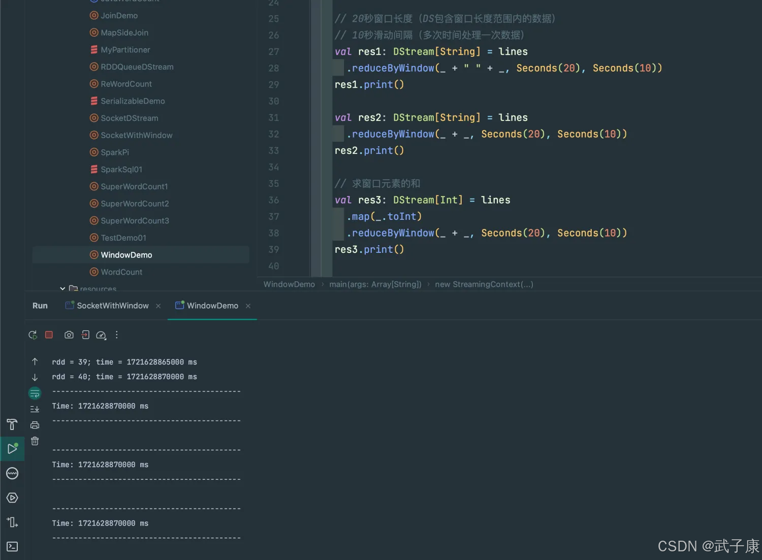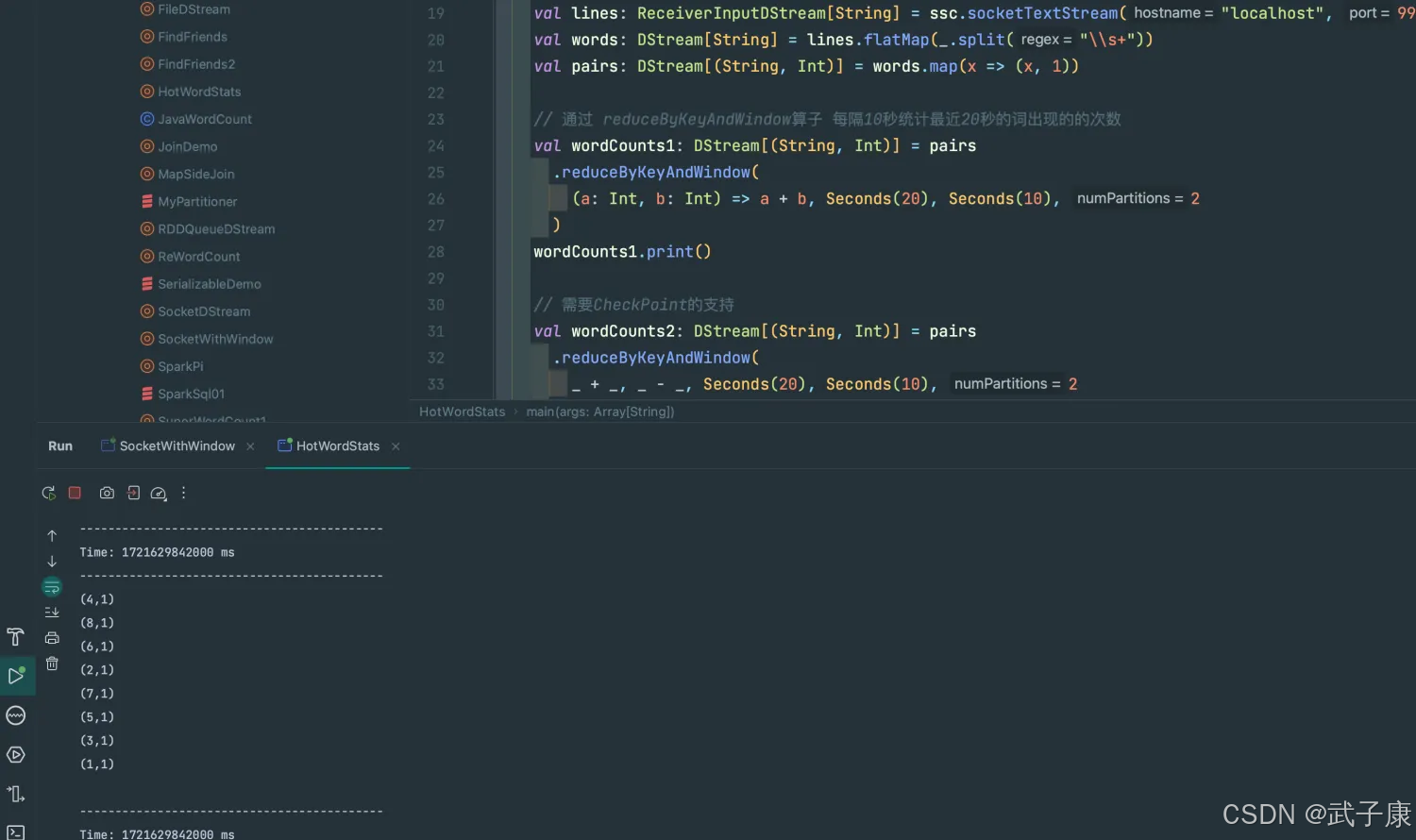 // 通过 reduceByKeyAndWindow算子 每隔10秒统计最近20秒的词出现的的次数 val wordCounts1: DStream[(String, Int)] = pairs .reduceByKeyAndWindow( (a: Int, b: Int) => a + b, Seconds(20), Seconds(10), 2 ) wordCounts1.print()