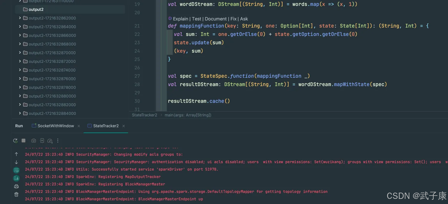 def main(args: Array[String]): Unit = { val conf: SparkConf = new SparkConf() .setAppName("StateTracker2") .setMaster("local[*]") val ssc = new StreamingContext(conf, Seconds(2)) ssc.sparkContext.setLogLevel("ERROR") ssc.checkpoint("checkpoint")