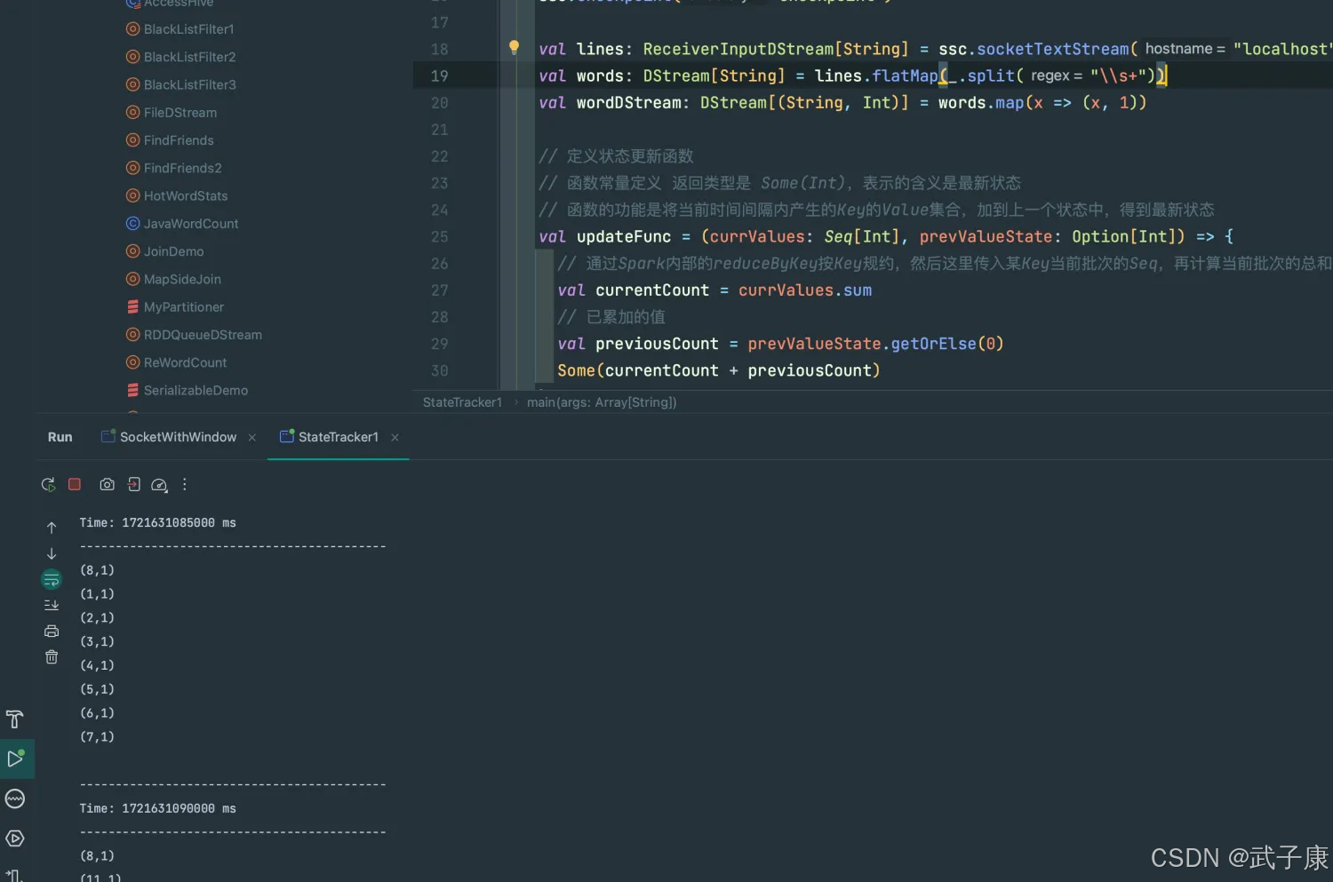 // 定义状态更新函数 // 函数常量定义 返回类型是 Some(Int),表示的含义是最新状态 // 函数的功能是将当前时间间隔内产生的Key的Value集合,加到上一个状态中,得到最新状态 val updateFunc = (currValues: Seq[Int], prevValueState: Option[Int]) => { // 通过Spark内部的reduceByKey按Key规约,然后这里传入某Key当前批次的Seq,再计算当前批次的总和 val currentCount = currValues.sum // 已累加的值 val previousCount = prevValueState.getOrElse(0) Some(currentCount + previousCount) }