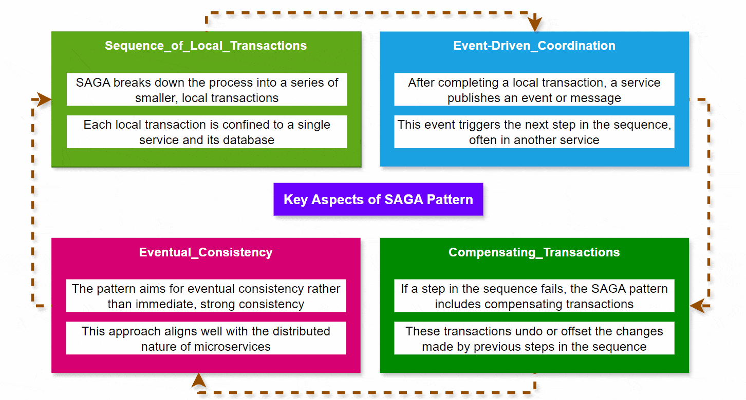 在 Saga 模式中,业务流程被分解为一系列局部事务。每个局部事务都会更新数据库,发布事件或消息以触发流程中的下一个事务。这种方法有助于在不同服务间保持数据一致性,确保在进入下一步骤前,之前的步骤都已完成。
