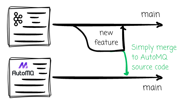 得益于此,AutoMQ 有底气为其 Diskless Kafka 方案承诺 100% 的 Kafka 兼容性;即便 Kafka 社区后续推出了诸如队列(queues)等前沿新特性,AutoMQ 也能通过合并上游代码,实现无缝集成与同步支持。