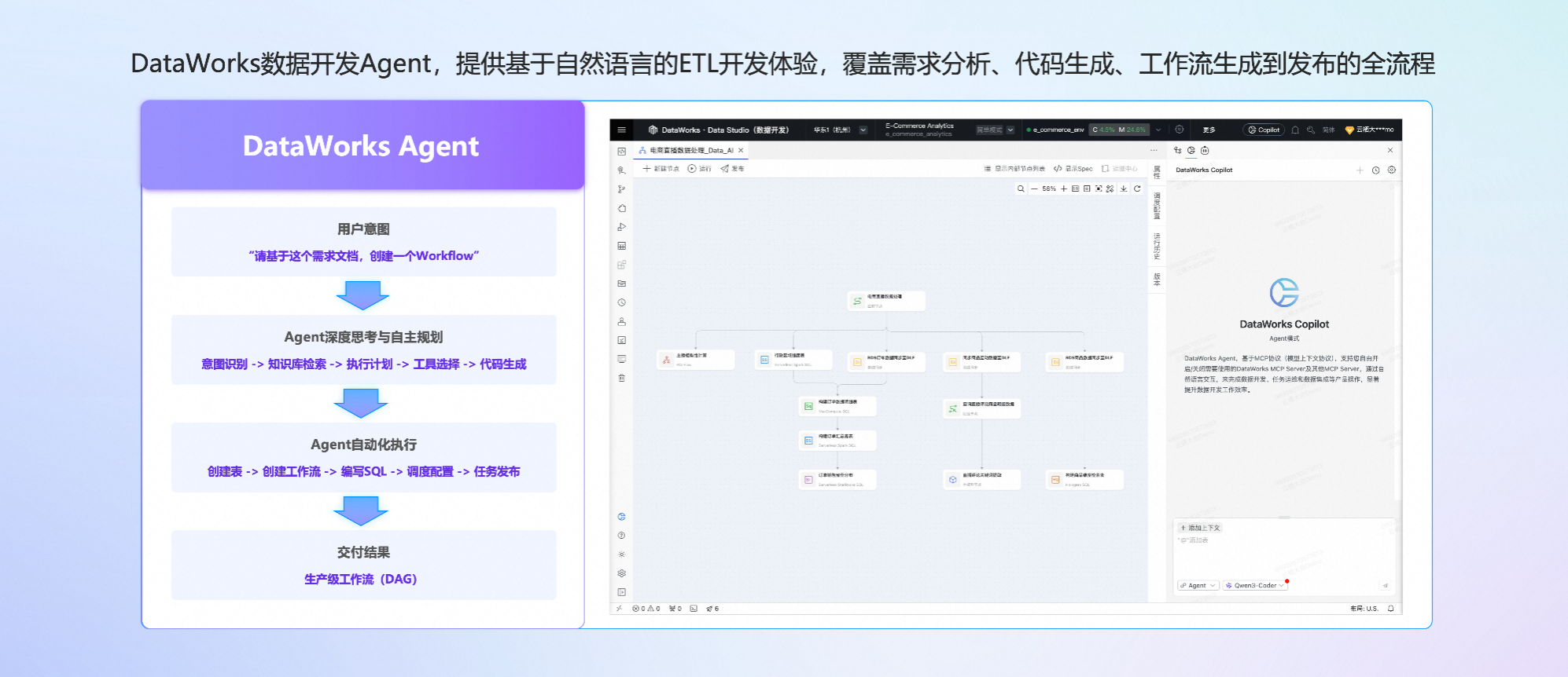 DataWorks 数据开发 Agent,可实现输入 ETL 需求文档,输出 ETL 工作流。用户只需输入自然语言需求或者需求描述文档,DataWorks Agent 可以理解用户意图,深度思考和自主制定规划,然后自动化执行规划,最终生成所需 ETL 工作流及任务代码。让 ETL 工程师从繁复的 SQL 开发和工具操作中解放出来,有更多时间来思考业务本身。