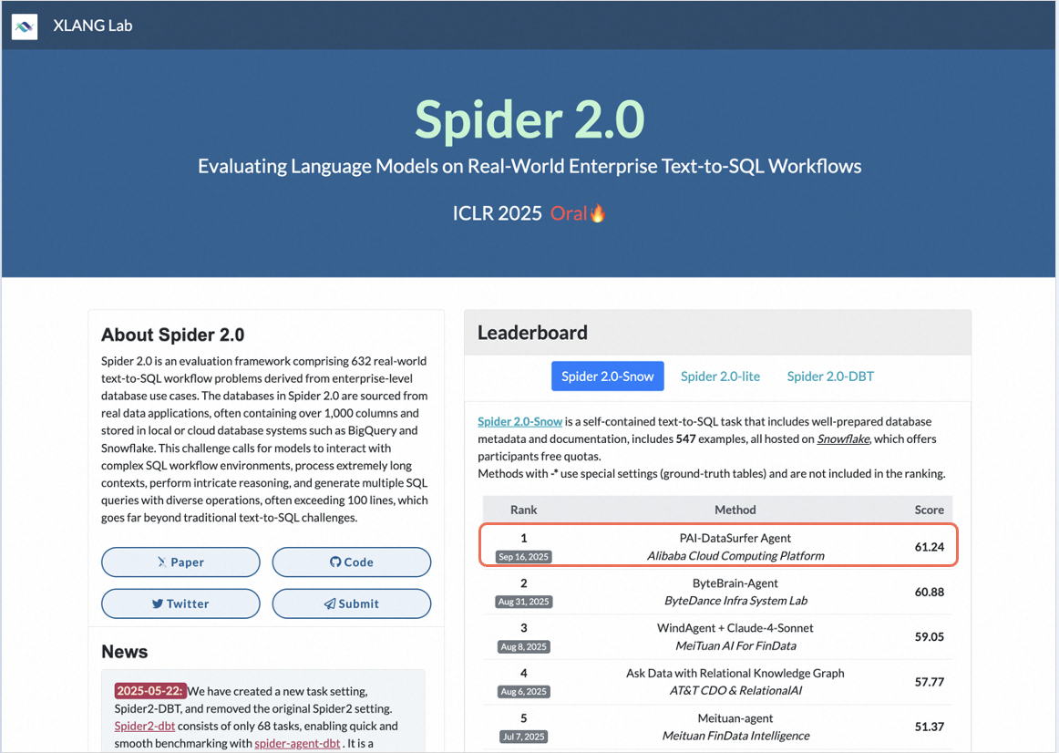 DataWorks Copilot 的 NL2SQL 服务在被誉为"最接近真实企业场景"的权威基准测试 Spider 2.0 榜单中位列全球第一。