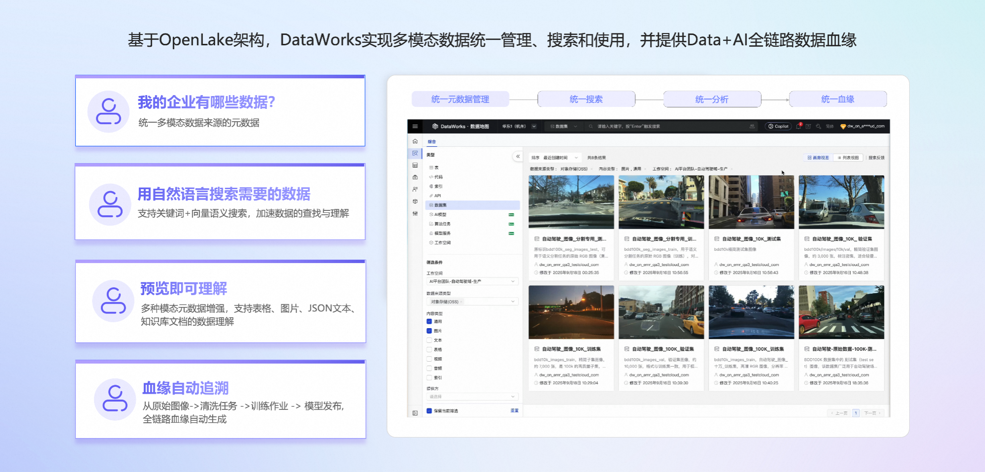 面对日益增长的非结构化数据,DataWorks 推出全新 多模态数据管理体系,帮助企业实现“看得见、找得到、管得住”。