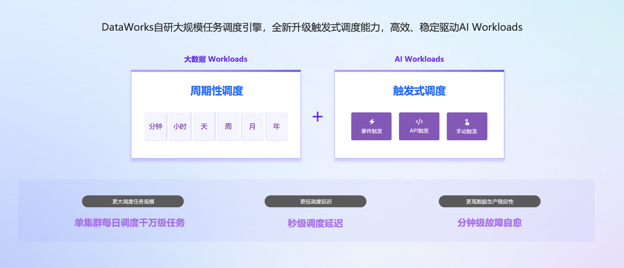 为此,DataWorks 对任务调度引擎进行了重大升级,全新升级了触发式调度的能力,用来高效稳定的驱动 AI 工作负载。