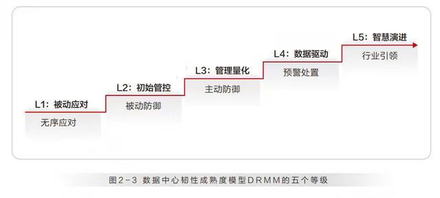 DRMM 将数据中心韧性分为五个等级:L1 为被动应对,数据中心主要依赖人工处理,应对能力弱;L2 是初步管控,开始建立基本的灾备和应急管理体系;L3 为管理量化,引入自动化和监控系统,能够主动识别并解决问题;L4 是数据驱动,通过数据分析优化管理,提升风险预测能力;L5 为智能演进,借助 AI 等技术实现自我优化,灵活应对变化。