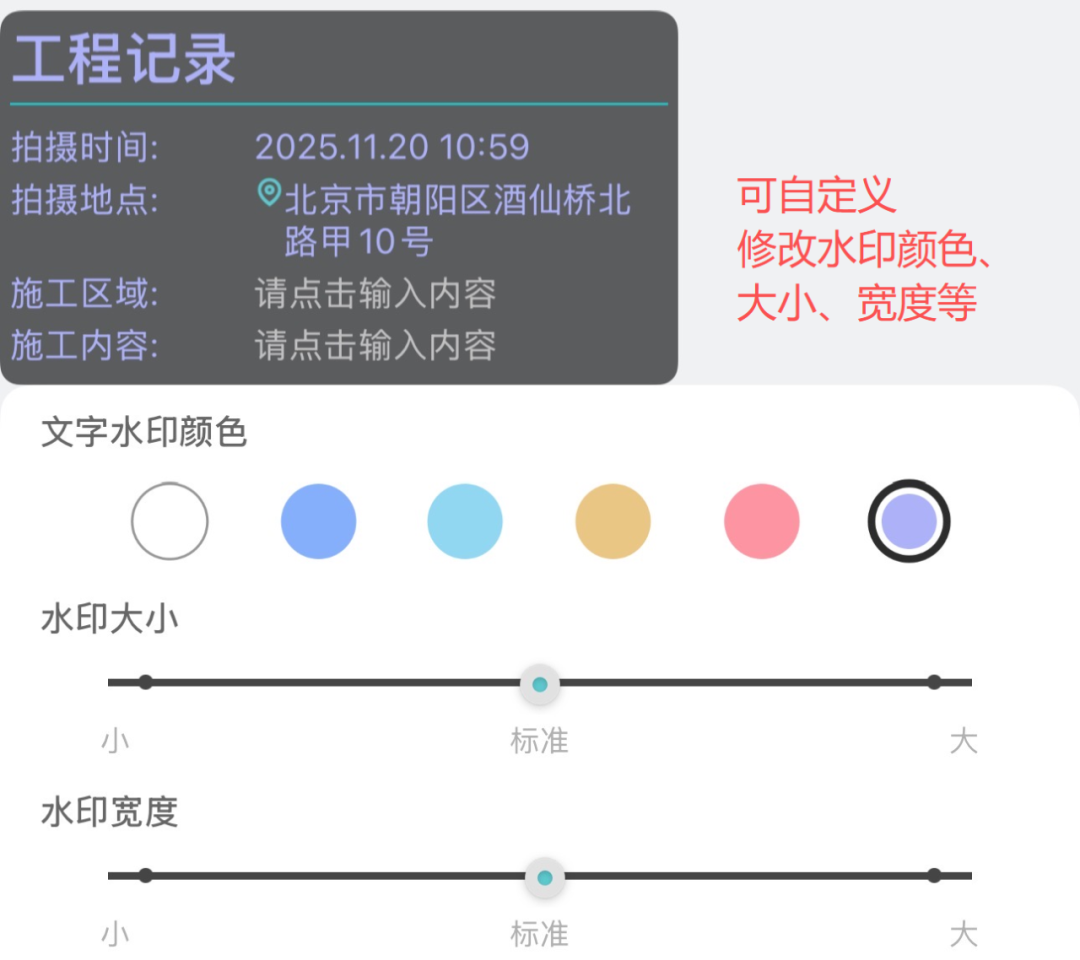 操作指南:水印相机自动嵌入真实时间、地点等信息,这类内容不可篡改。用户还可调整水印样式(颜色、字体等),在保存前确认信息准确。带水印的照片与图纸关联后,即为验收与责任判定提供可靠依据,有效避免纠纷。