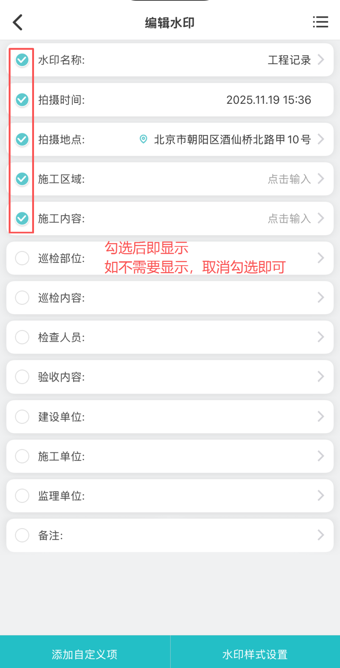 操作指南:水印相机支持自定义编辑项目名称、施工区域、施工内容等关键信息。直接点击水印条目即可修改,还可通过“添加自定义项”调整内容,满足不同项目需求,让每一张照片都成为完整的工作记录。