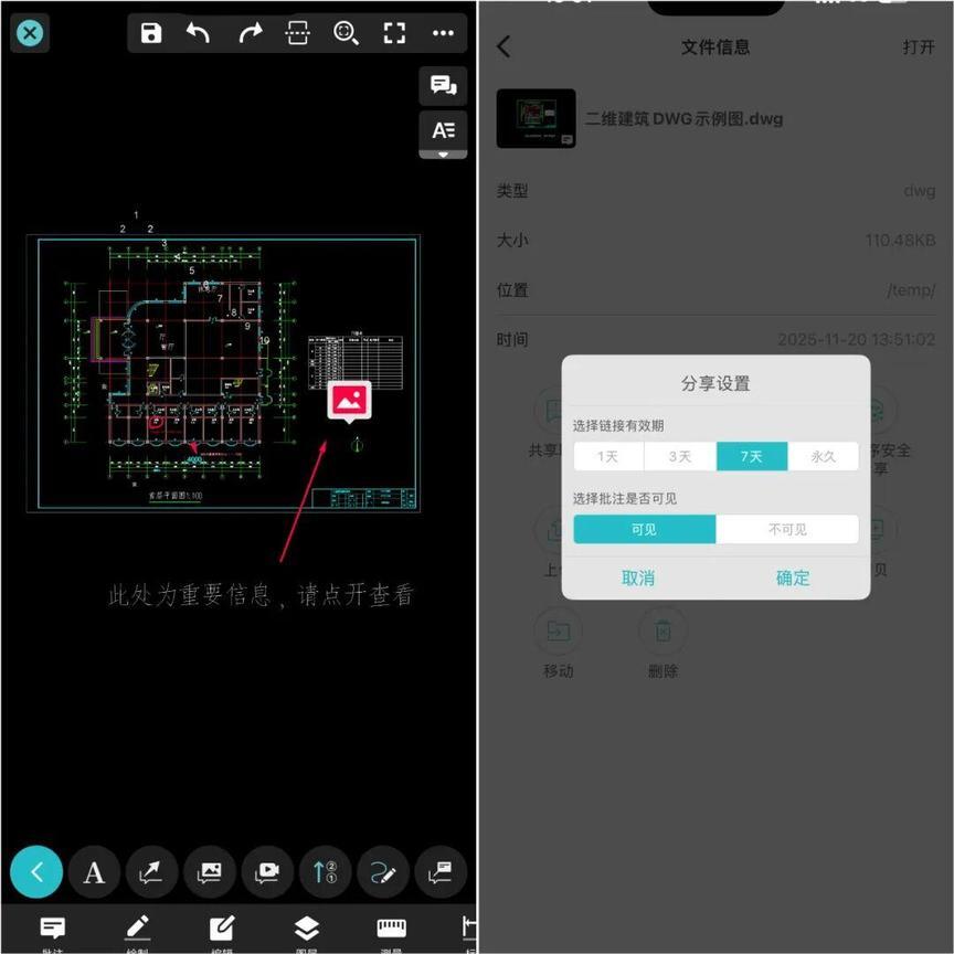 4、结合其他功能使用:可搭配 CAD 看图王的批注、测量等功能,全面提升施工现场管理效率。