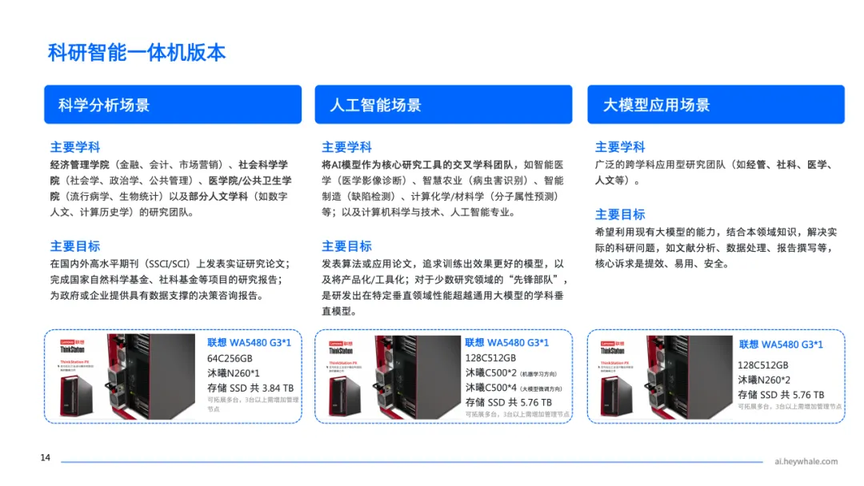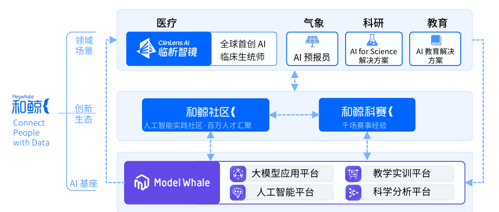 在“AI+科研”方面,和鲸携手联想集团、沐曦股份,联合发布国内首款科研智能一体机。一体机为高校与科研机构升级至下一代智能科研基础设施,提供了集成化解决方案。该一体机以联想 ThinkStation 工作站为硬件底座、和鲸 ModelWhale 为软件核心,搭载沐曦高性能算力芯片,实现从底层算力调度到上层协同研发的全栈集成,助力科研团队实现数据安全可控、分析流程标准化、研究资产沉淀与成果可视化,真正实现“像用水电一样使用 AI”,提升科研效率与创新质量。