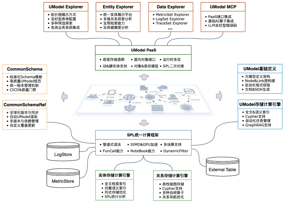 技术基础设施: 专为可观测场景构建的实体、关系的存储计算引擎,能够快速回溯到任意时刻的系统状态,支持高性能的图查询、关系计算、多维分析等能力。提供管道式、高性能 SPL 统一计算框架,支持关联 UModel、实体、关系、观测数据等各类数据。