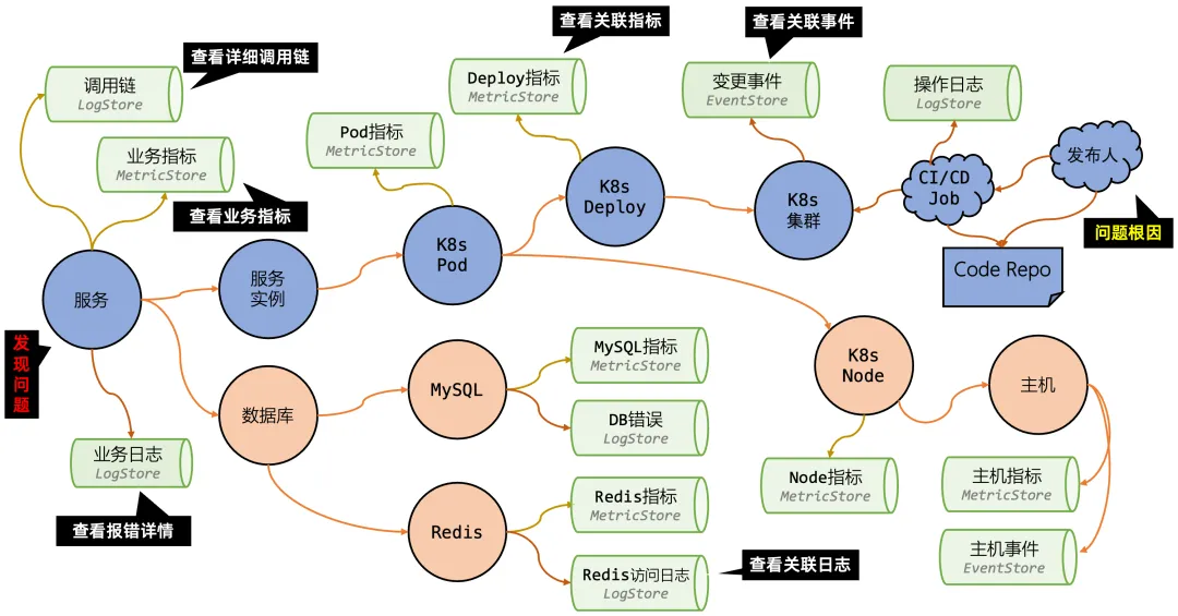 根据实体的连接关系一步步排查,每类实体都有对应的可观测数据,按图索骥。