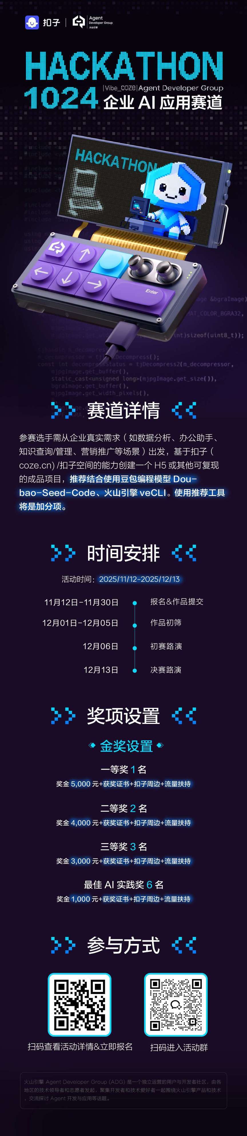 参赛选手需从企业真实需求(如数据分析、办公助手、知识查询/管理、营销推广等场景)出发,基于扣子(coze.cn) /扣子空间的能力创建一个 H5 或其他可复现的成品项目,推荐结合使用豆包编程模型 Doubao-Seed-Code、火山引擎 veCLI。使用推荐工具将是加分项,详见评分规则。