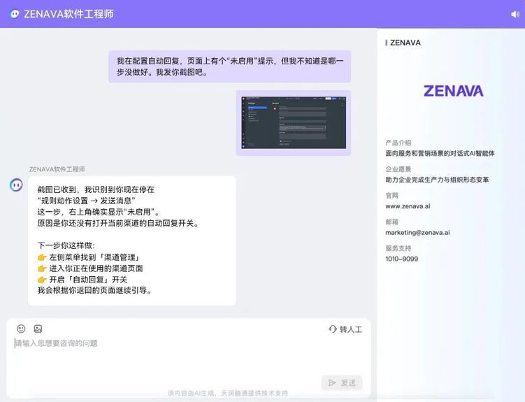 而使用 ZENAVA 后,用户只需上传一张截图,系统即可识别界面位置和当前步骤,并给出对应指导。原本必须人工处理的问题,AI 也能胜任;原本需要多轮沟通才能讲清的情况,现在一张图片即可解决,大幅提升处理效率与用户体验。