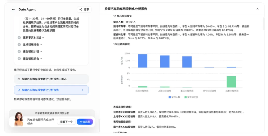 高端智能电动品牌极氪(ZEEKR)选择与火山引擎合作,引入了一个企业级“数据智能体”——火山引擎 Data Agent。火山引擎 Data Agent 能深度理解与运用企业数据资产,主动思考、分析和行动。在这位 AI 数据专家的协助下,极氪汽车将传统耗时数日的“工单式”数据供给,升级为分钟级响应的“对话式”交互,为汽车行业提供了一个“数据智能”实践范本。