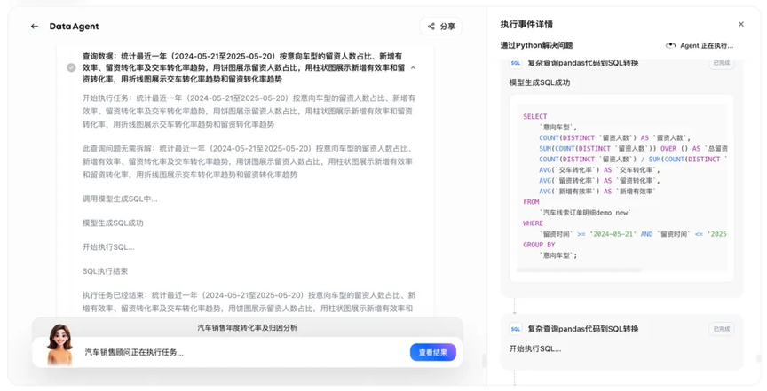 行业领先的“文转 SQL”准确性,可以把你说的“人话”自动翻译成数据库能执行的 SQL 语句,精准理解业务人员的问题。(SQL:结构化查询语言)