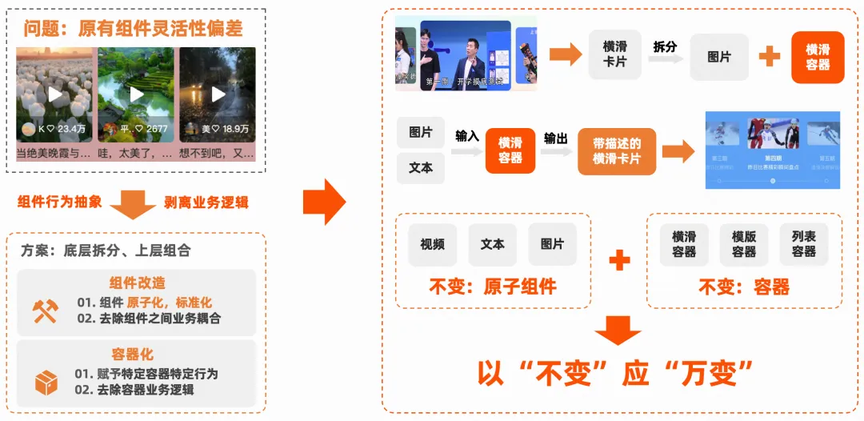 通过组件原子化 + 容器化的组合方式,使得搭建更灵活。例如:一个支持左右滑动并带有缩放效果的组件,可以将其拆分为“图片组件” 和 "聚光灯容器"这两个基本单位。基于这两类稳定单元的不同组合,能够衍生出丰富的功能玩法,真正实现“以不变应万变”。