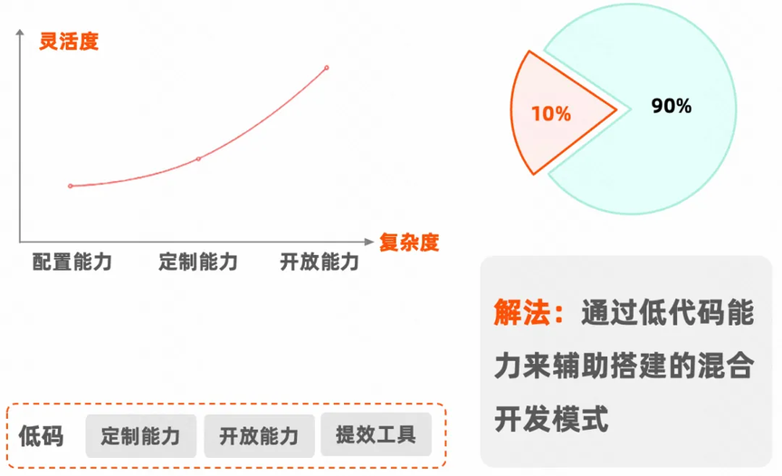 高效方面:尽可能通过无代码方式满足需求。这就要求搭建方式足够灵活、易于组合,并对无法直接搭建的创新需求提供快速定制开发能力。