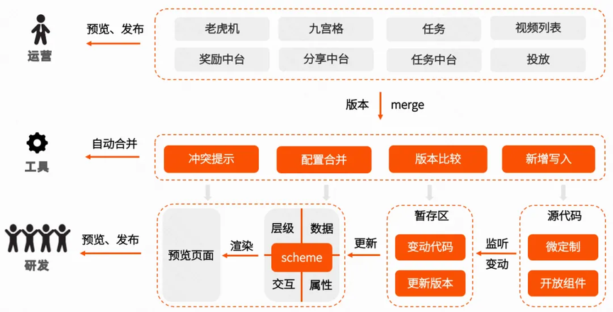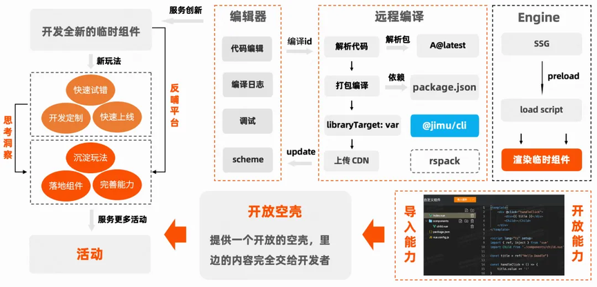 3.对外开放能力:提供轻量、临时性的开发方案,帮助业务快速上线并验证效果。技术实现上,开发者可在浏览器中直接编写代码,无需配置本地环境,实现“开箱即用”。代码提交后经由远程编译服务打包,最终发布至 CDN。C 端渲染时,将动态加载该定制组件,并融合平台的基础能力——如 Context、Bridge 与数据埋点等——使开发者既能快速实现定制,又能复用平台的通用底层能力。Context:用于识别并兼容不同的运行环境(如快手 APP、快影 APP、回森等)。Bridge:为 H5 提供与客户端交互的统一通道。