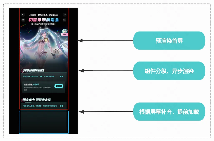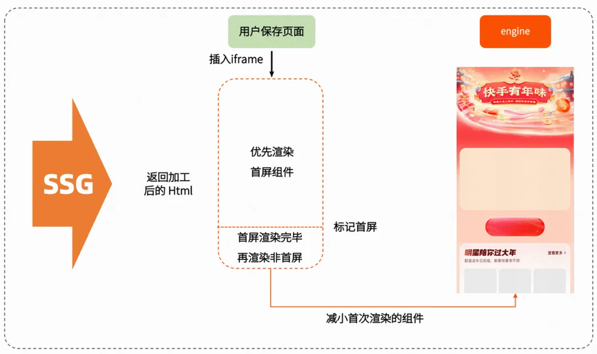 上面是对整个页面做的 SSG,但是在实际渲染过程中,用户优先看到的是首屏的内容,可以进一步优化首屏的性能。优先只渲染首屏的组件,当首屏组件渲染完毕之后,再渲染非首屏组件。