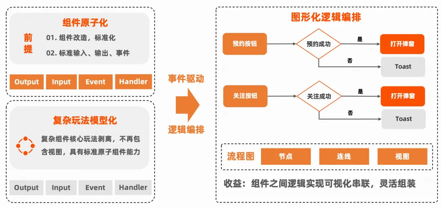 我们通过逻辑编排功能,以可视化方式灵活串联组件间的业务逻辑,显著提升复杂交互的搭建效率。例如,在“用户点击直播间预约按钮成功预约后自动触发抽奖”这一场景