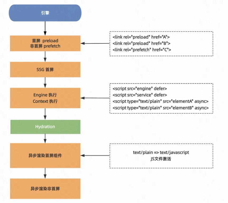 为避免某些浏览器中 preload/prefetch 失效导致重复请求,SSG 阶段将 script 输出为 type="text/plain",在适当时机再切换为 type="text/javascript" 执行,例如: