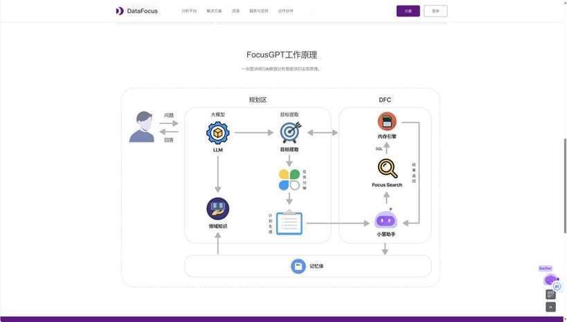 DataFocus 旗下 FocusGPT 工作原理,展示了从用户提问到任务分解,再到通过小慧助手和 Focus Search 引擎生成结果的完整流程