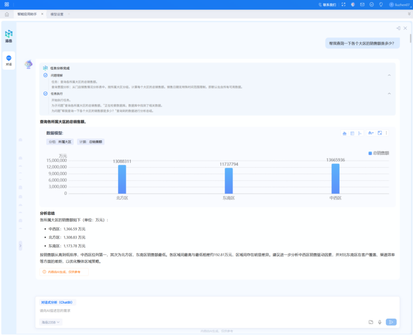 正因如此,数据分析领域亟需一场智能变革,而 ChatBI 的出现恰逢其时。用户通过自然语言提问,系统便能自动解析意图、查询数据库并生成可视化图表,大幅降低技术门槛;ChatBI 支持多轮对话与智能追问,用户可基于初始结果持续提问(如“为什么上海销量下滑?哪个渠道影响最大?”),系统可自动下钻分析,快速定位问题根源,从而提升分析效率和灵活性。