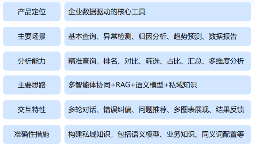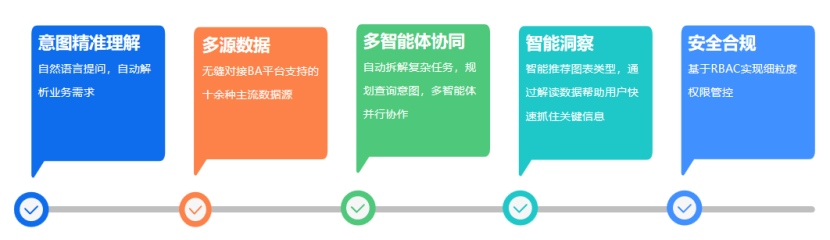 可靠精准的技术底座:采用“多智能体协同+RAG+语义模型”融合架构,并深度融合语义模型、业务知识等企业私域知识体系,保障分析过程智能性与分析结果的准确性、可解释性。