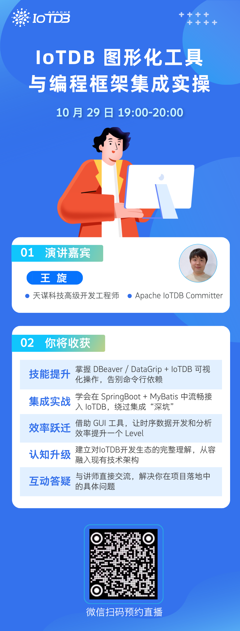 📆10 月 29 日(周三)19:00,我们将通过一场全链路实战演示,带你深入 IoTDB 强大的编程与可视化生态,一次性解决上述所有难题。