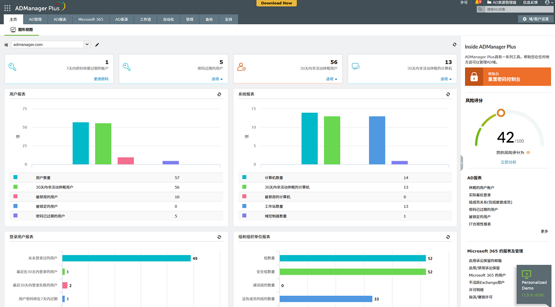 ADManager Plus 就像你的专属 AD 审计员。虽然你已经知道哪台服务器持有重要的架构主机或 PDC 模拟器角色,但真正的问题是:这台服务器当前的健康状况和安全性如何?ADManager Plus 超越了简单的角色查询,提供了关键的风险评估报告,为你的整个域控制器集群生成集中式报告,直接保障 FSMO 角色的安全。
