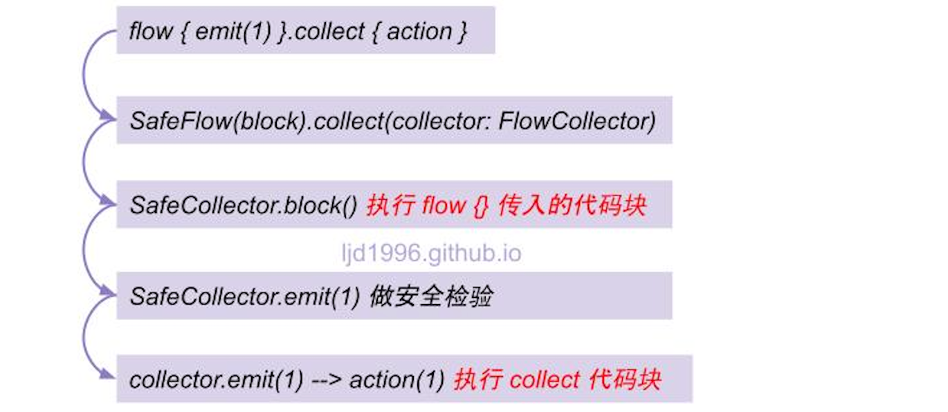 ),它是一个扩展函数,所以执行的示例代码中的 emit(1) 其实就是调用了 SafeCollector.emit(1), 然后在 SafeCollector 中对 FlowCollector 做了一层安全校验后,最后还是会调用 FlowCollector.emit 方法,即创建 SafeCollector 时传入的 collector 对象的 emit 方法。这里只关注核心流程,故不贴出具体代码了。