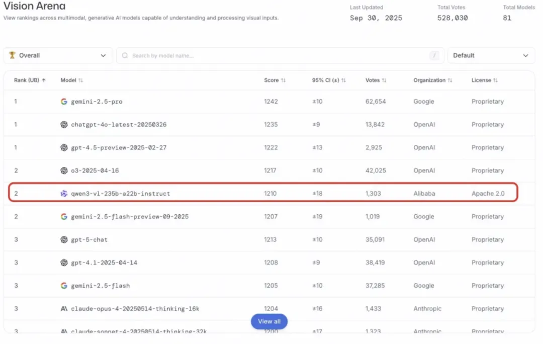 继在全球 AI 开源社区获得广泛认可后,Qwen3-VL (Qwen 视觉语言模型) 近日再次迎来重磅更新。它不仅在 Chatbot Arena 的 Vision Arena 子榜单中位居全球开源冠军,并在 Text Arena 斩获纯文本赛道开源第一,成为首个同时问鼎两大领域的开源大模型,还在 OpenRouter 图像处理榜单上跃升至全球第一。