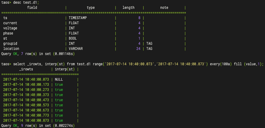 INTERP 函数用于在指定时间断面获取指定列的记录值,当该时间断面没有符合条件的行数据时,会根据 FILL 参数自动进行插值。在 2.x 版本中,该函数尚不支持对 BOOL 类型数据的插值,而在 3.0 版本中,这一限制已被优化,现可对 BOOL 类型字段执行插值操作: