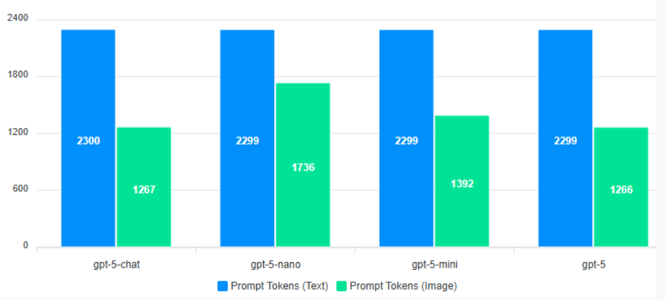 除 gpt-5-chat 之外的所有模型在使用图像输入时都会消耗显著更多的生成 token。