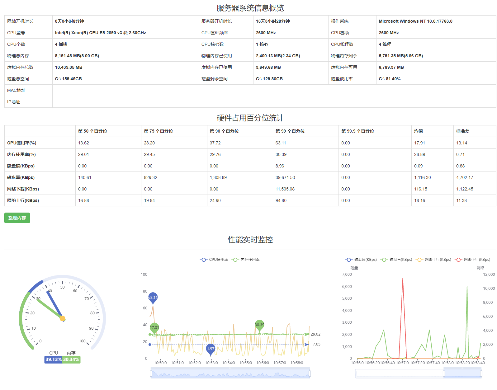 服务器性能监控:实时监控服务器的运行状态,包括 CPU、网络带宽、磁盘使用率、内存占用等。
