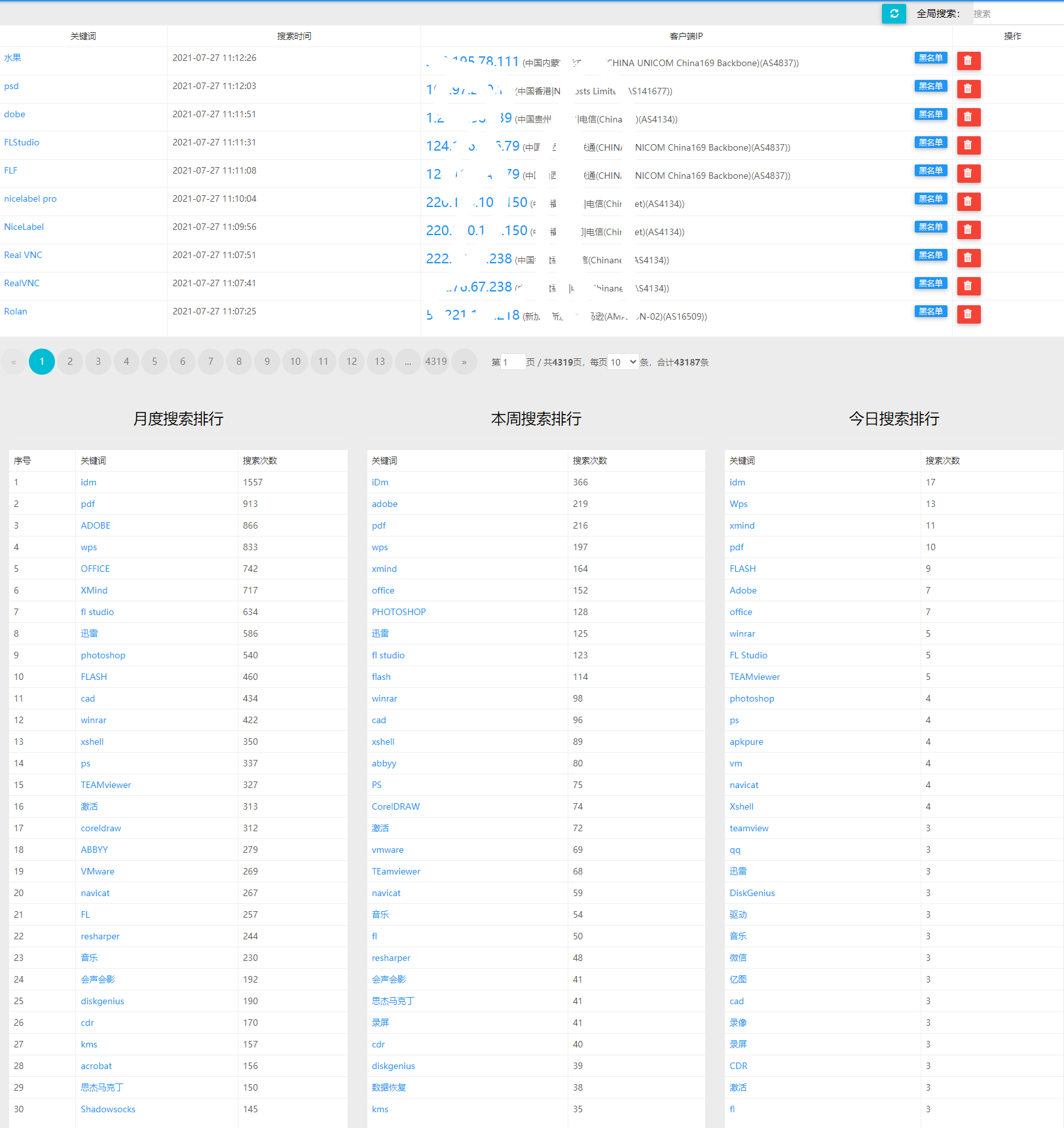 搜索统计:记录前台用户每 Session 周期内的关键词搜索,用于热词统计。