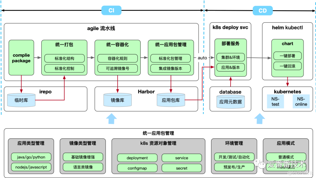 除了关注标准化与自动化带化效率的提升,同时提供统一应用包管理,涵盖镜像、k8s 资源、以及环境等相关周边资源,进一步提升持续集成能力。