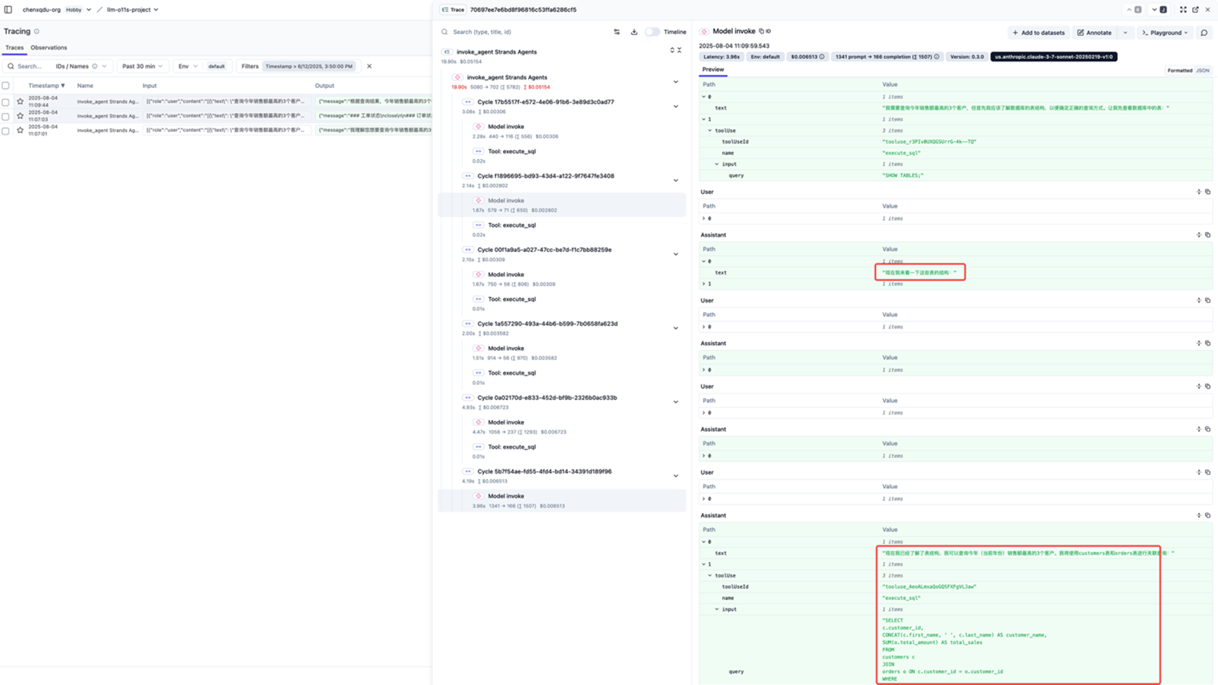 使用两个不同的 user 对相同的问题进行测试,在 Langfuse 中观察到不同的 Latency, Token 和 Cost , 可以观察到 Claude 3.7 和 Nova Lite 分析过程和对工具的调用次数上一致,Claude 3.7 在成本上更有优势,而 Nova Lite 则在成本上更有优势。