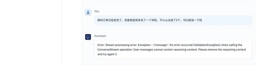 假设基于测试结果,团队希望使用 Nova Lite 为主要模型,Claude 3.7 为备用模型 ,对话过程中交替切换 LLM 来进行充分测试,发现出现错误。