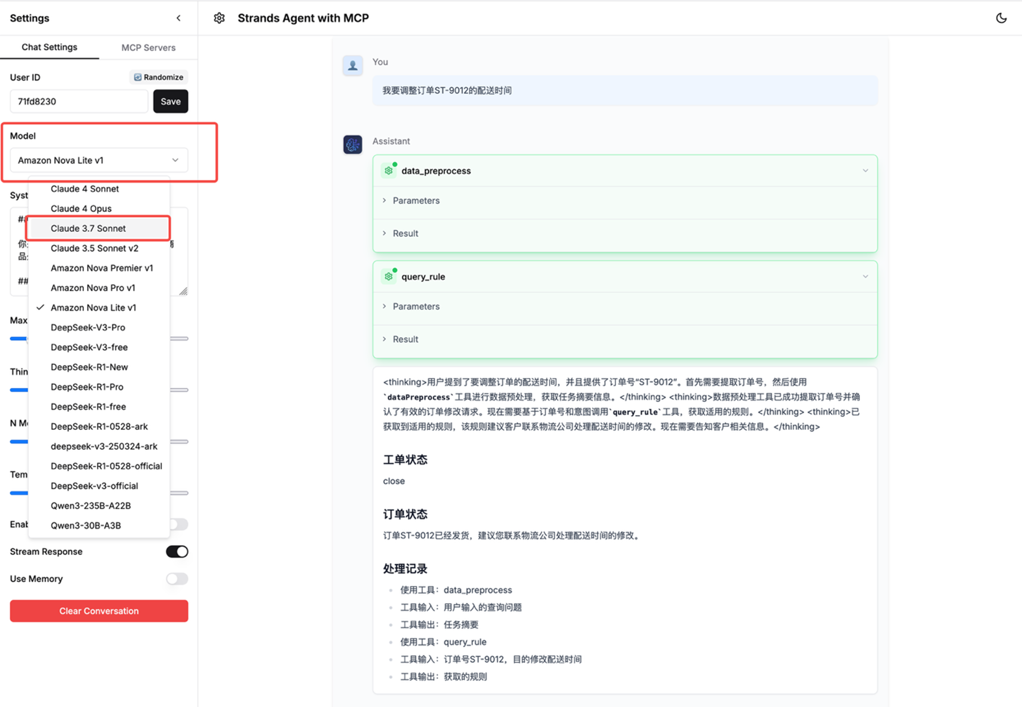 示例环境可根据 workshop 进行创建,创建资源包括一个含有订单数据表格并通过 api gateway 对外暴露的电商系统,和一个通过网页交互的电商售后智能客服应用,智能客服 Agent 应用通过添加多个 MCP servers,其中包括调用电商系统的 API Gateway 接口的工具,来实现对电商系统中的订单进行查询并按照售后流程定义规则进行处理的功能。以下为智能客服的页面截图,支持添加丰富的 MCP servers, 选择不同的 LLM 模型。