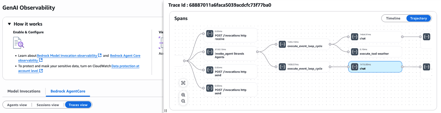 我们提供基于 Jupyter Notebook 的快速使用指导,帮助您在本地运行基于 Strands 框架的 AI Agent,并从 Cloudwatch GenAI Observability 上观测 Agent 的运行状况。您可以从 此处 获取此快速使用指导。