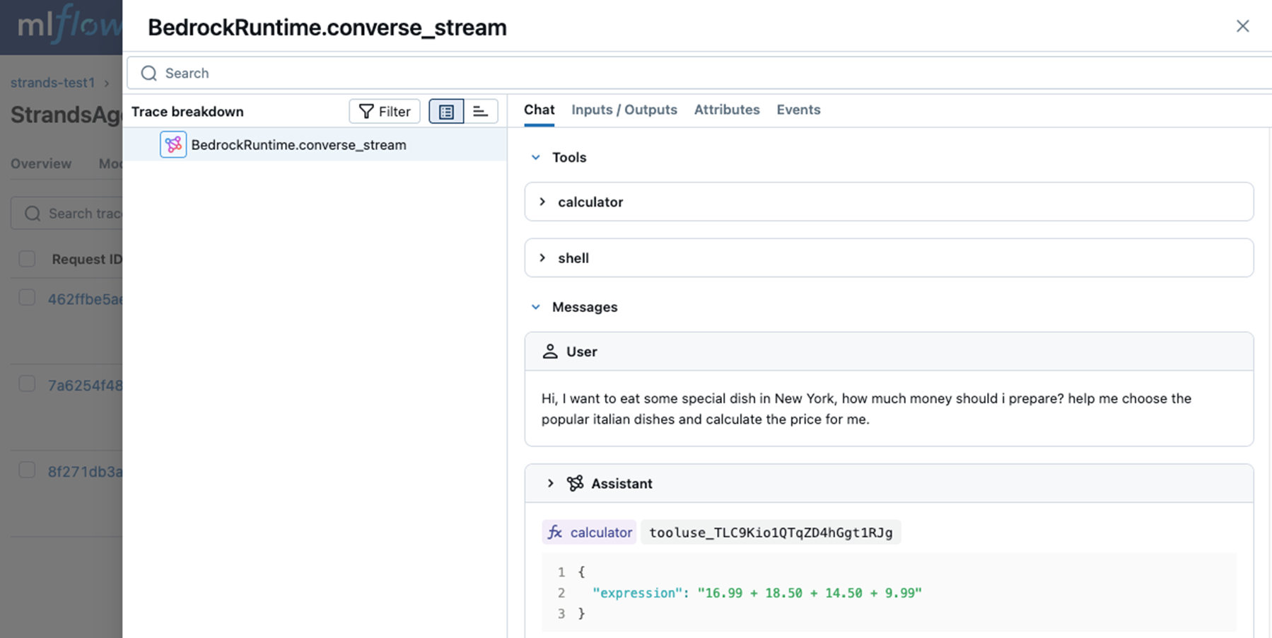 这些能力通过捕获工作负载服务、节点和工具执行的详细信息,为您的 AI 工作负载提供可观测性。可以在 MLFlow Tracking Server 前端的 Trace 选项卡中,查看这些完整记录的执行信息。见如下示例: