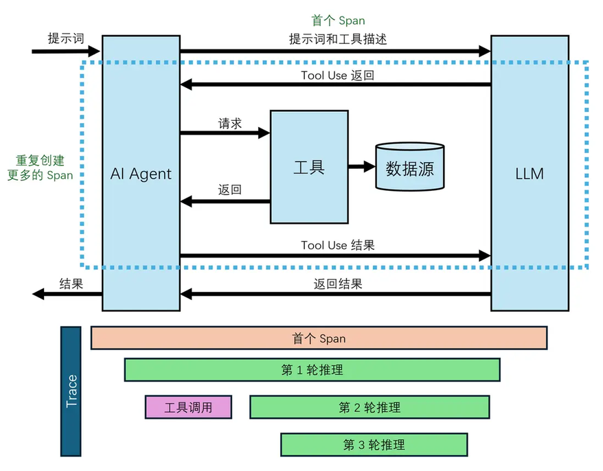1、端到端提示词跟踪(End-to-end prompt tracing) – 跟踪 AI Agent 的所有行为(包含大模型推理和工具调用)
