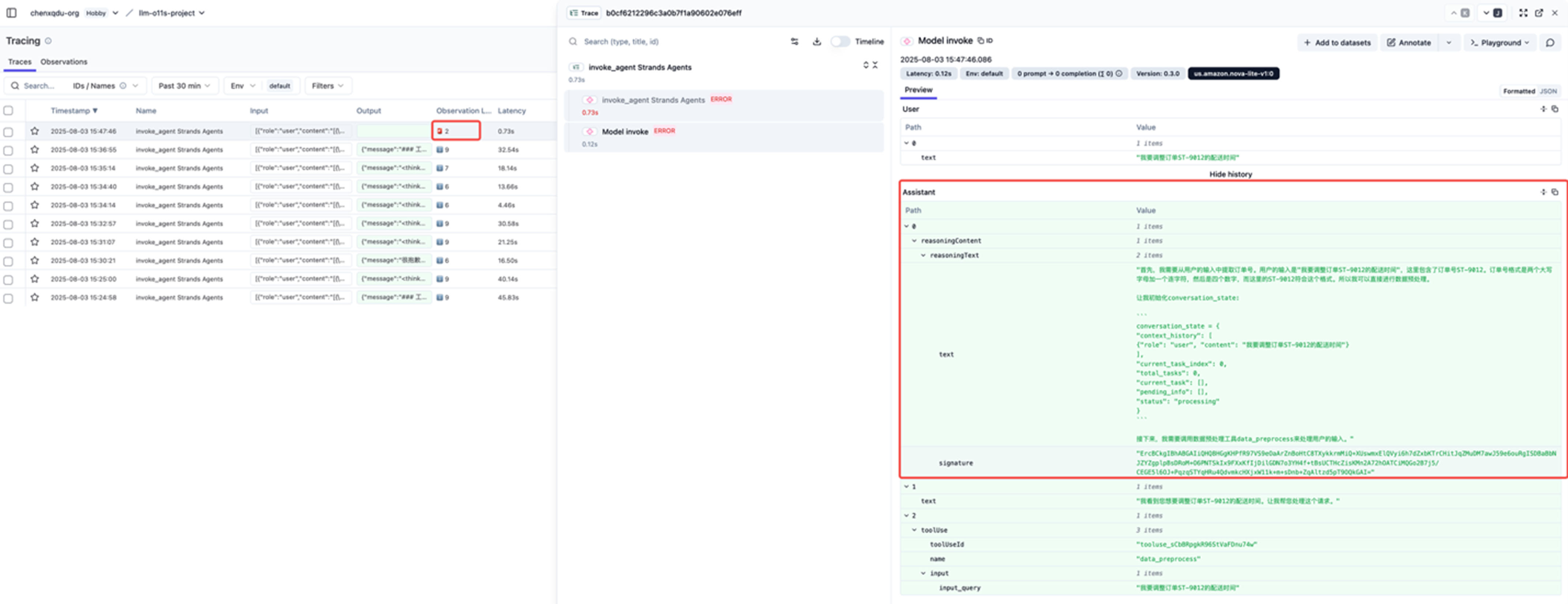 从 Langfuse 页面可以快速定位到历史对话采用 Claude 3.7 模型和当前切换的 Nova Lite 模型的信息格式不一致导致调用出错。基于此类的追踪分析,可以针对性的快速解决开发迭代和生产中遇到的问题。