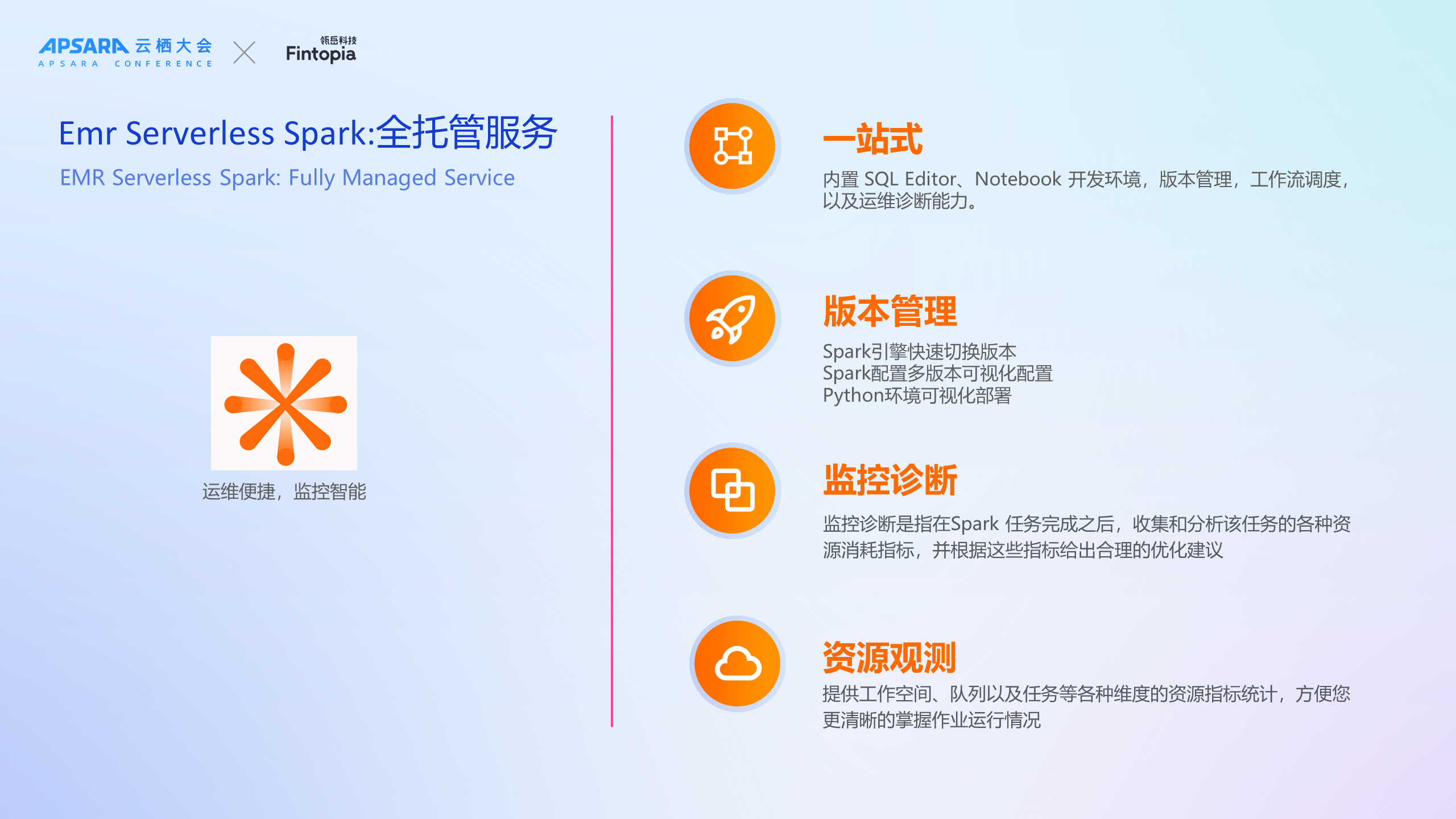 性能方面,EMR Serverless Spark 自研 Fusion 引擎,内置高性能向量化计算和 RSS 能力,相比开源版本性能大幅提升