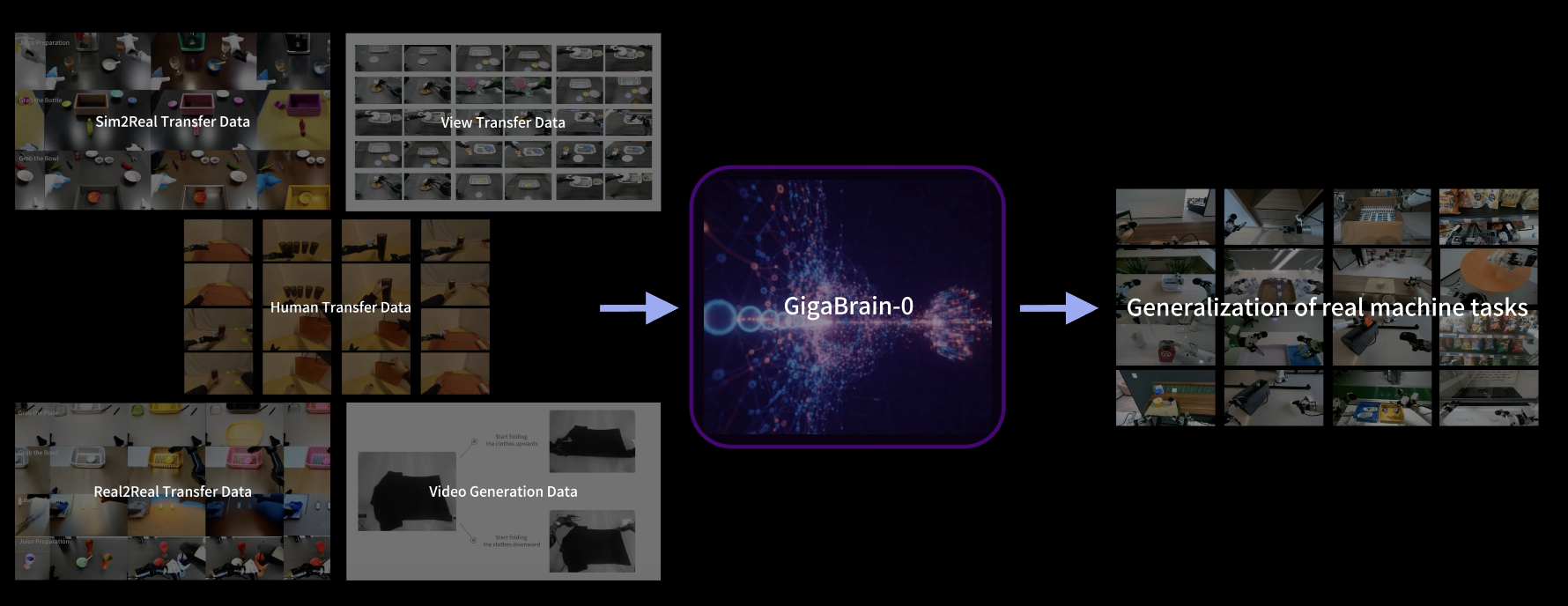 GigaBrain-0 的技术核心是基于世界模型驱动的数据生成范式。具体来说,它利用先进的生成模型(Generative Models)模拟物理世界,生成丰富的、多样化的视觉、语言和行动序列数据。这些合成数据被用于训练 VLA 模型,使其能够学习复杂的感知-决策-行动策略。该方法通过仿真环境中的大规模数据预训练,将具身智能的训练效率和泛化能力提升至新的水平,减少了对昂贵且耗时的真实世界交互数据的需求。