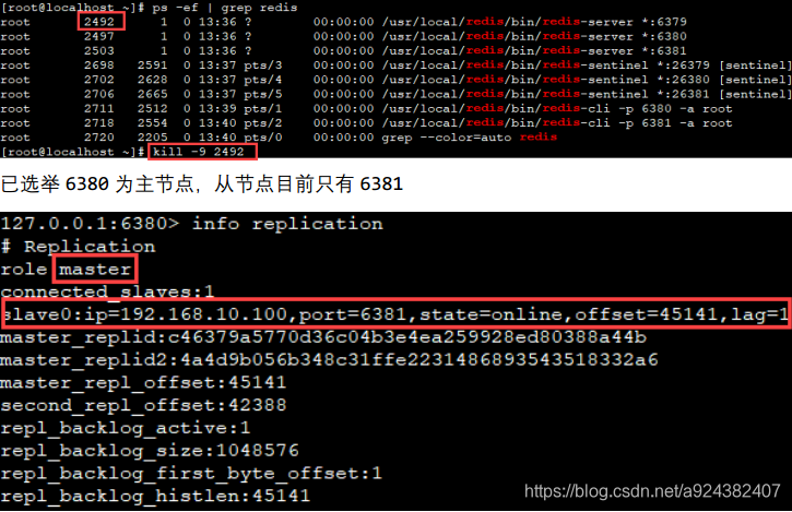 kill -9 终止 redis-6379,查看哨兵是否选举了新的主节点