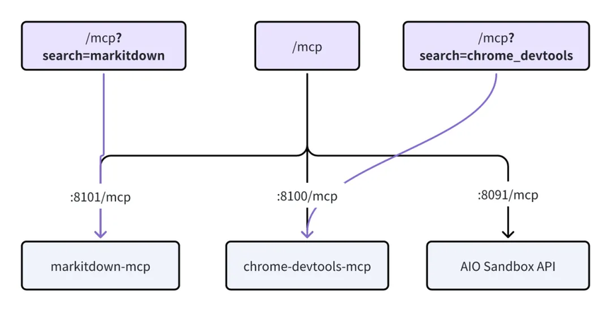 通过统一入口 /mcp 聚合多个 MCP Server(例如 chrome-devtools-mcp),支持参数级过滤,并可为工具名添加前缀(namespacing)。